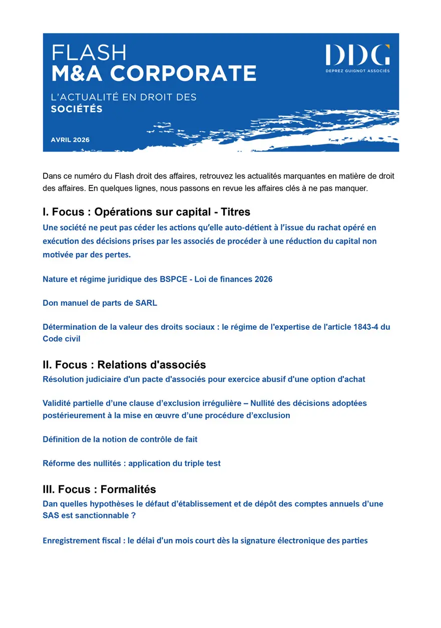 Dans ce numéro du Flash Corporate M&A, retrouvez les actualités marquantes en matière de droit des affaires de ces dernières semaines.